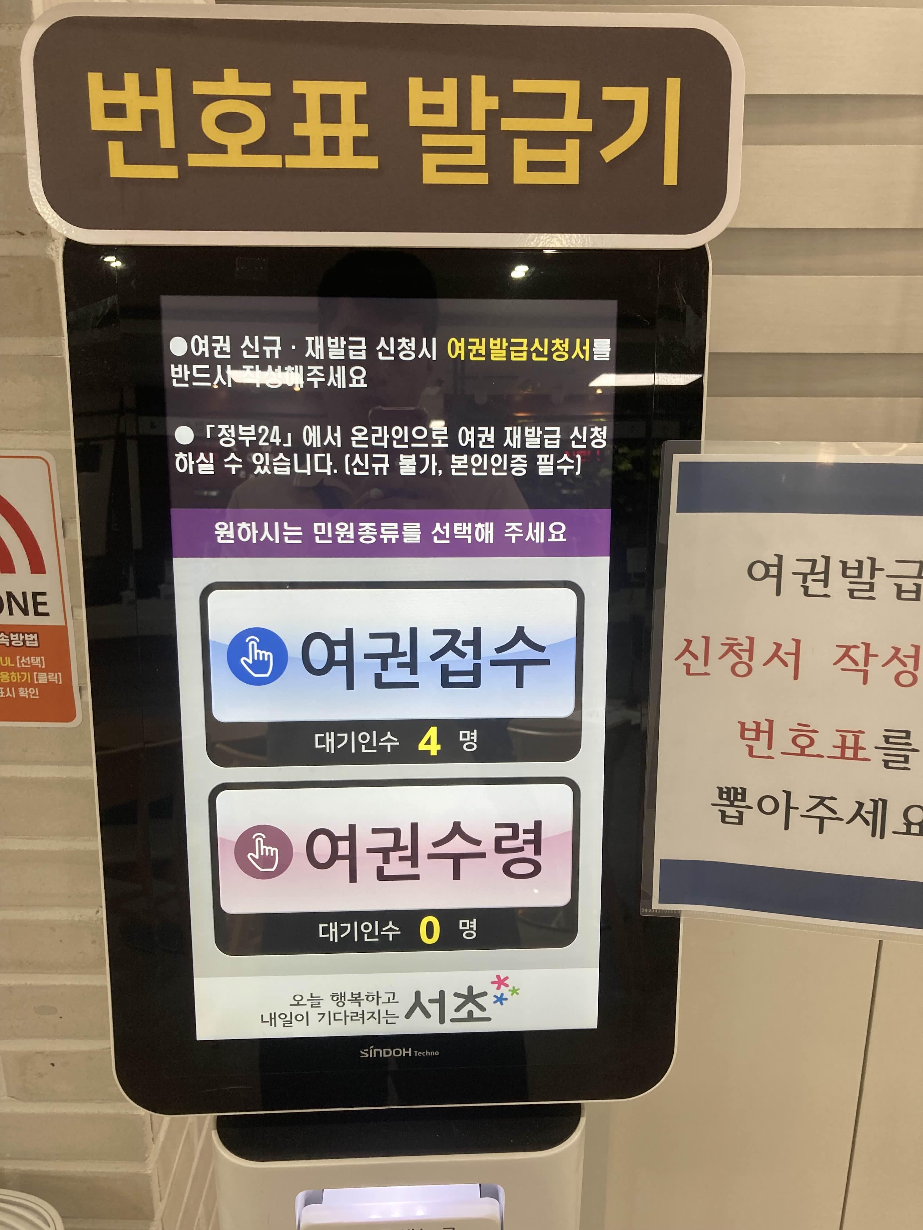 들어오면 번호표를 먼저 뽑아주세요. 다행히 여권수령 대기자가 없습니다.