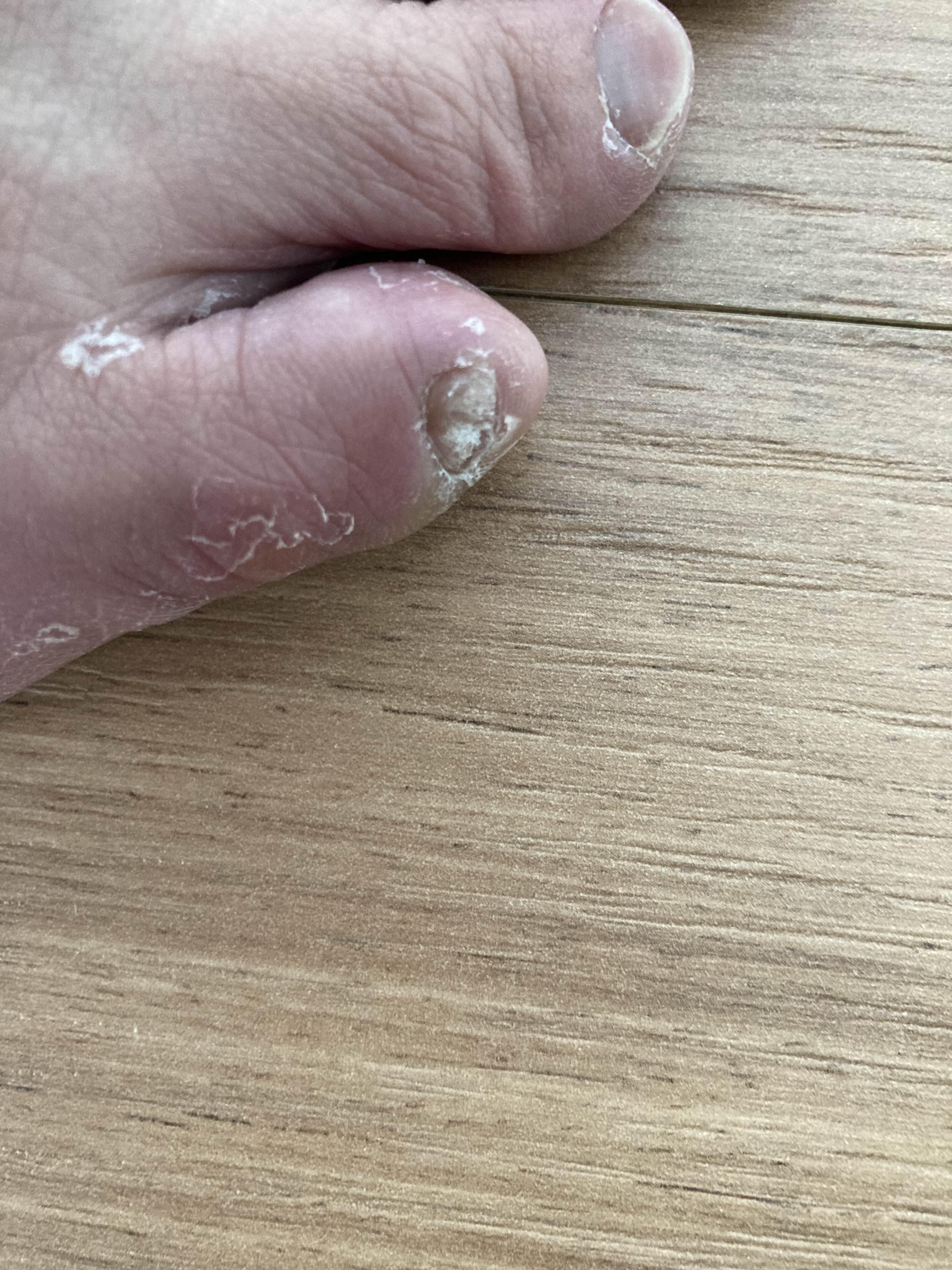발톱 주변의 피부 각질이 항상 있었는데 (왼쪽), 이제는 각질 형태가 보이지 않습니다. (오른쪽)