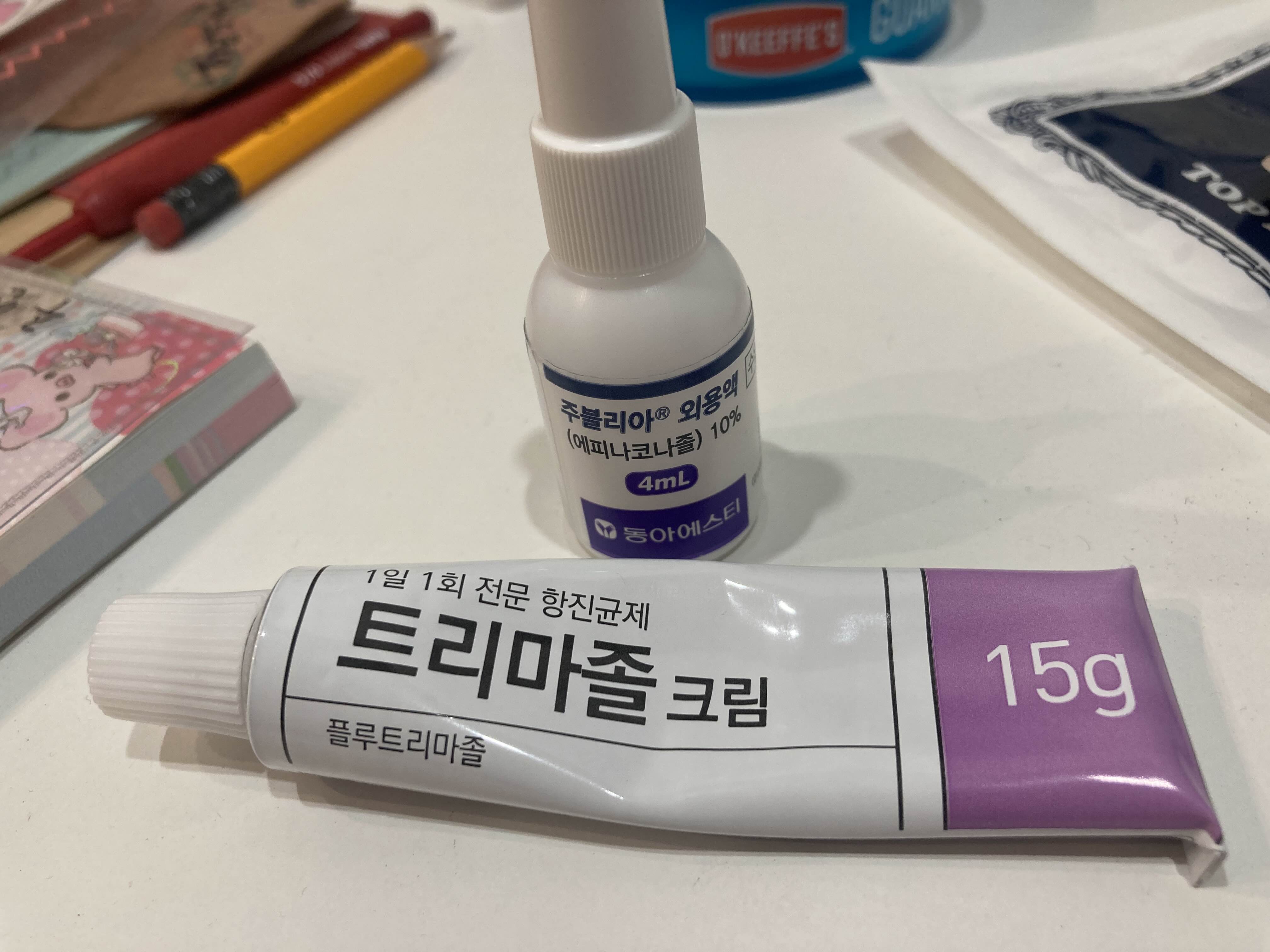 아래 사진의 약 입니다. 하나는 피부에 바르는 약, 다른 하나는 발톱에 바르는 약 이에요.