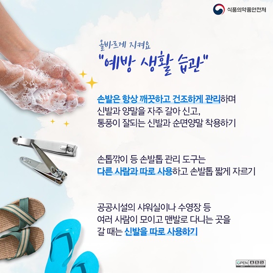5) 공공 장소 이용 시 주의: 공공 샤워실, 수영장, 운동 시설 등에서는 가능한 한 방역된 슬리퍼나 발 샌들을 사용하고, 발이 접촉할 수 있는 표면을 피하는 것이 좋습니다.
