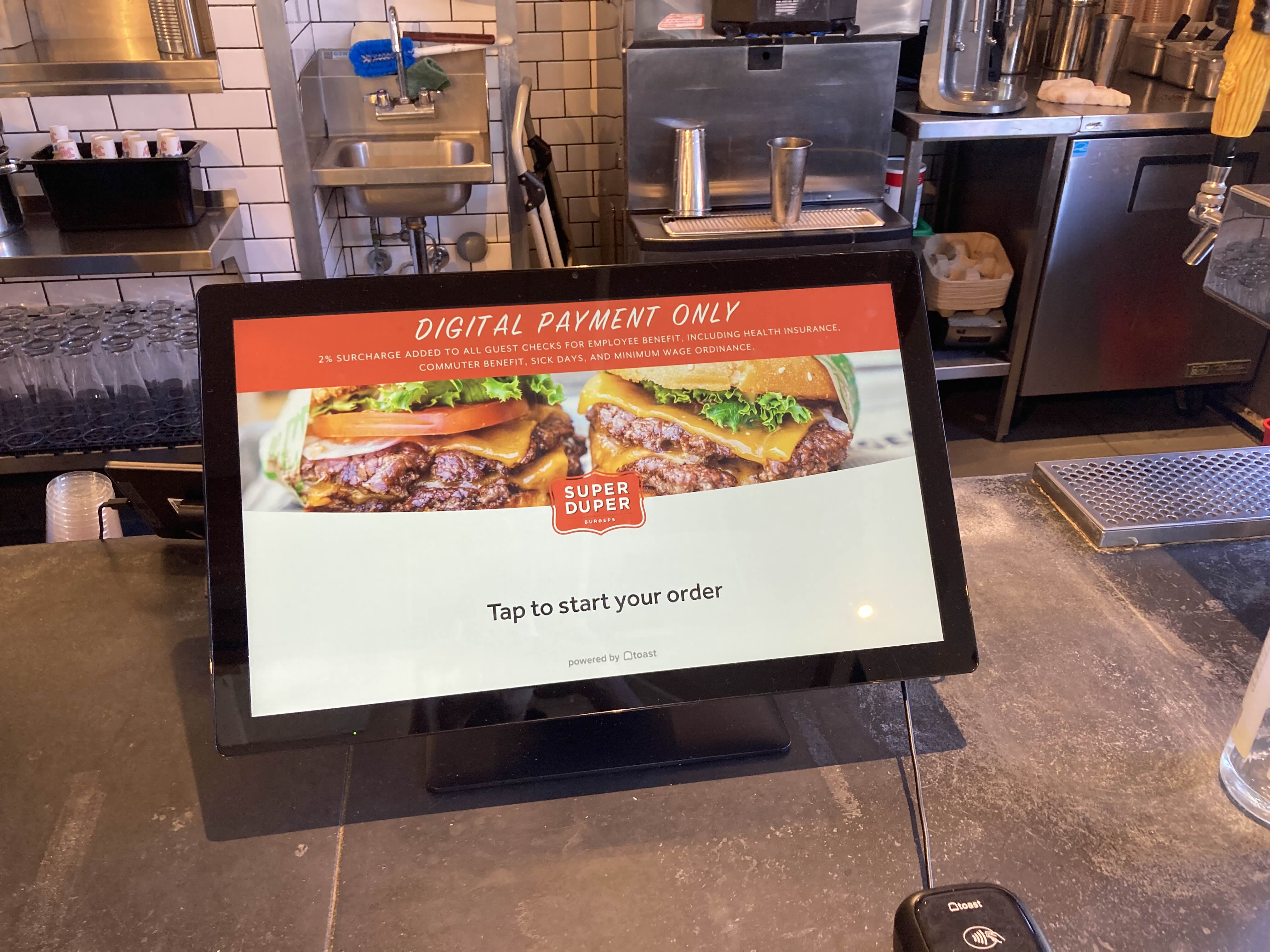 슈퍼두퍼햄버거는 키오스크를 이용해서 주문하고 결제하는 시스템입니다.