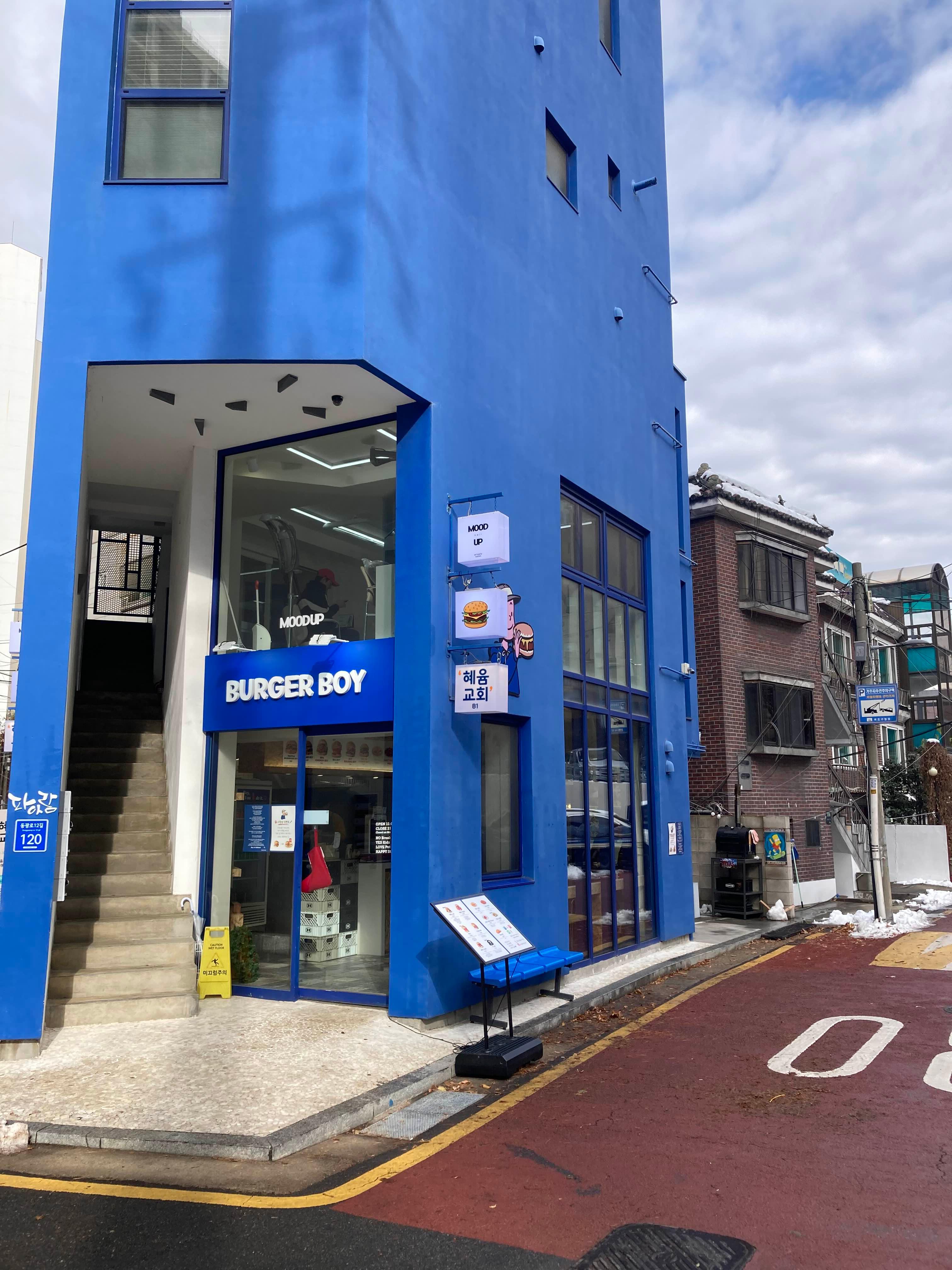 건물 전체가 파랑색이라서 멀리서 봐도 한눈에 들어옵니다. 버거보이의 캐릭터도 파랑색과 잘 어울려서 모르는분들이 보면 버거보이가 만든 건물로 오해할 것 같아요.ㅎㅎㅎ 전용 주차장은 1~2대만 가능하지만, 주변에 잠시 정차할 공간들이 있으니 참고 해주세요.