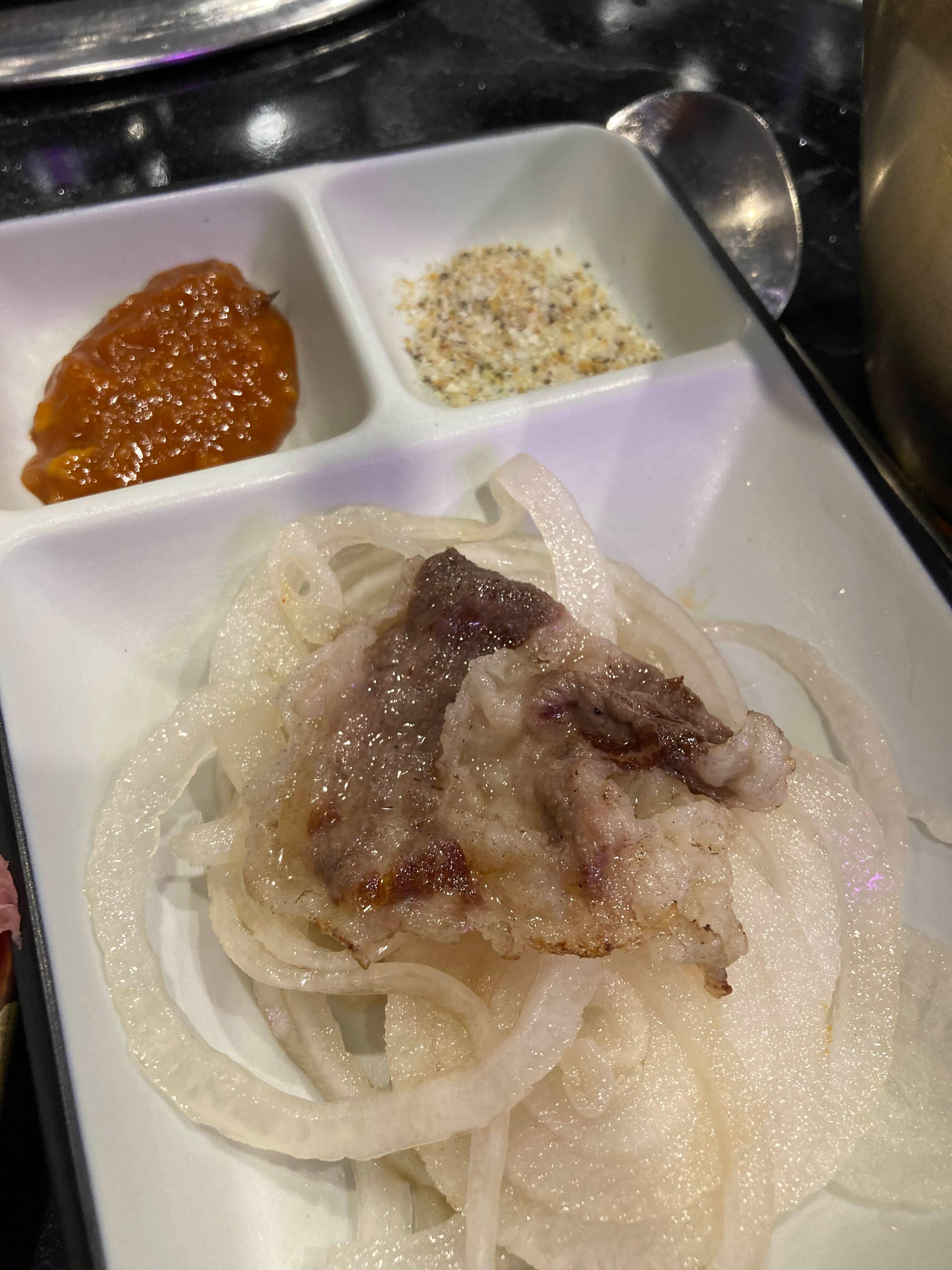 그리고 쌈장과 소금이 있는 접시를 보시면 앞접시로 활용할 수 있도록 디자인 되어 있어요. 양파를 덜어서 먹을수 있고, 고기를 구워서 앞접시로 사용할 수 있습니다.