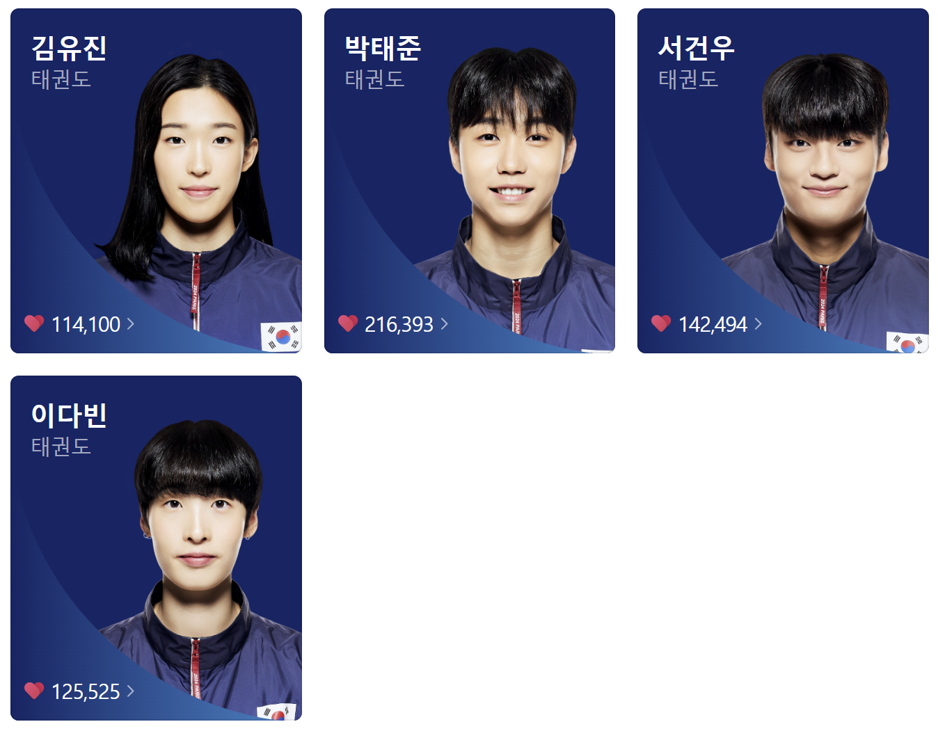 모두가 목에 금메달을 걸어서 태권도 종주국의 영광을 높이고, 개인적으로도 올림픽 금메달리스트라는 영광을 얻으셨으면 좋겠어요. 집안의 영광 이겠네요 ㅎㅎㅎ