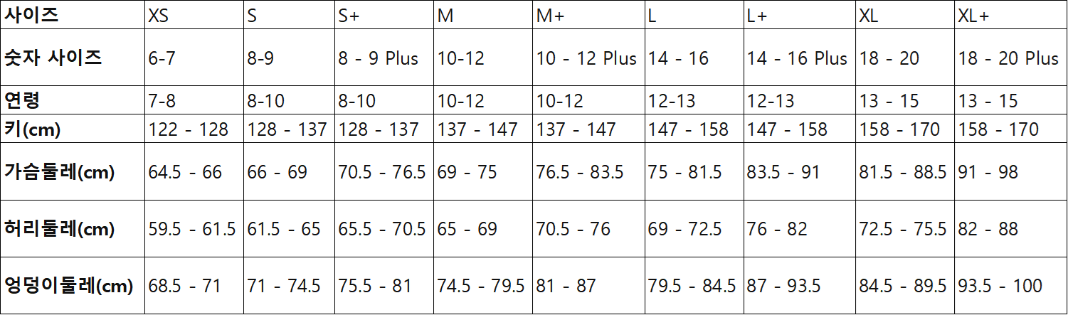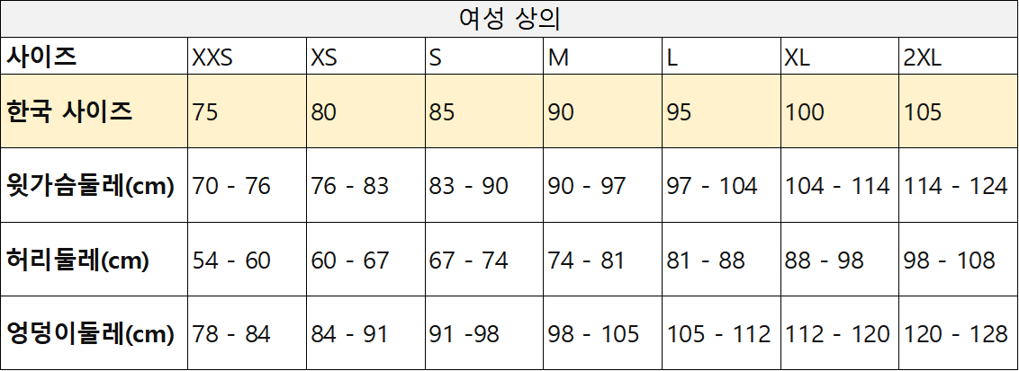 XXS~2XL 까지... 남자와 동일하게 우리나라보다 한치수 작게 선택을 해야될 것 같아요.