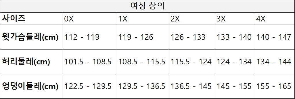 만약 사이즈 체계가 0X, 1X, 2X 처럼 되어 있다면 아래표를 참고하세요.