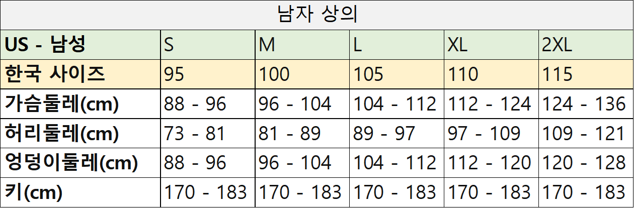 그래서 미국에서 옷을 구매하기 위한 사이즈 비교표를 준비 해봤습니다.