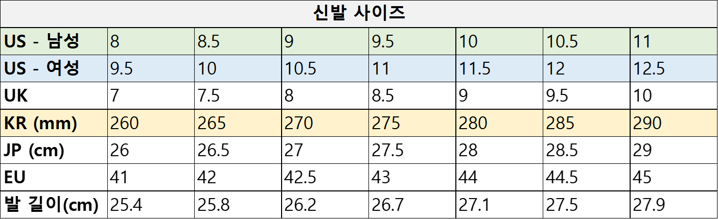 미국 운동화와 옷(상의,하의) 구매를 위한 사이즈 비교를 알아봤습니다.